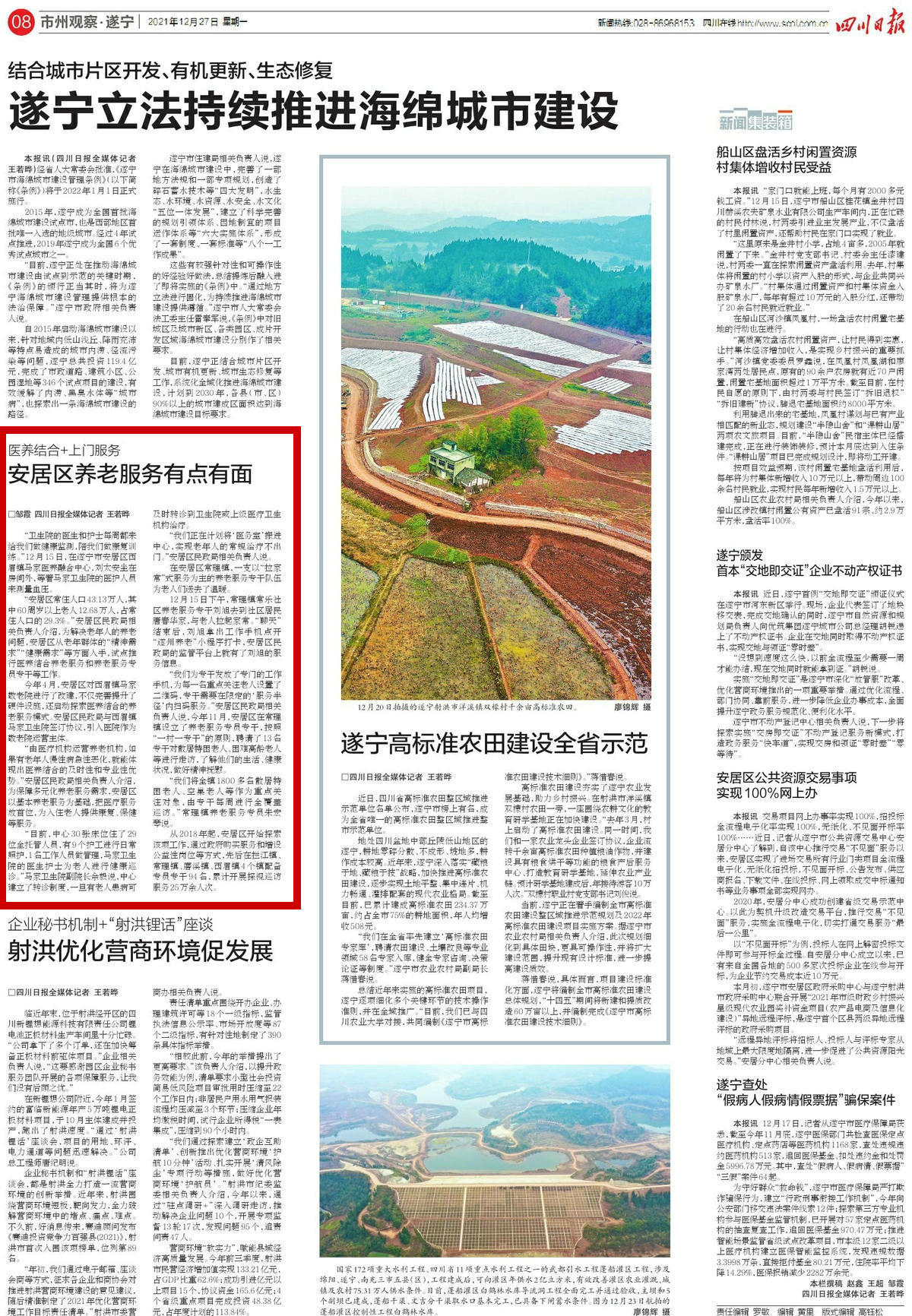 “安居区常住人口43.13万人,其中60周岁以上老人12.68万人,占常住人口的29.3%。”安居区民政局相关负责人介绍,为解决老年人的养老问题,安居区从老年群体的“精神需求”“健康需求”等方面入手,试点推行医养结合养老服务和养老服务专员专干等工作。