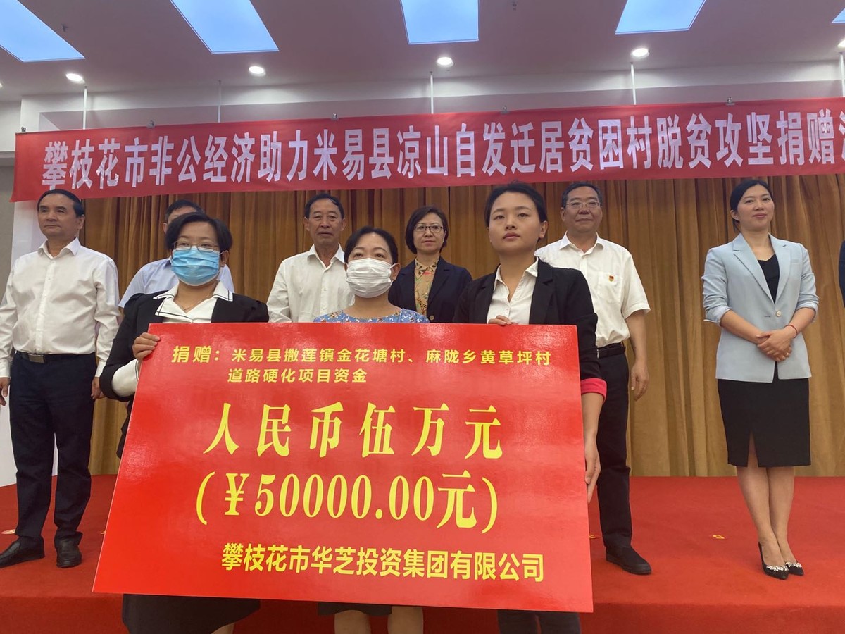 “四川龙蟒矿冶有限公司向米易县撒莲镇金花塘村、麻陇乡黄草坪村捐款50万元,四川安宁铁钛股份有限公司捐款60万元。”4月24日,攀枝花市举行非公经济助力米易县凉山自发迁居贫困村脱贫攻坚捐赠活动,16家爱心企业以及2家商会共同为米易县撒莲镇金花塘村、麻陇乡黄草坪村捐款捐物共计225万元。