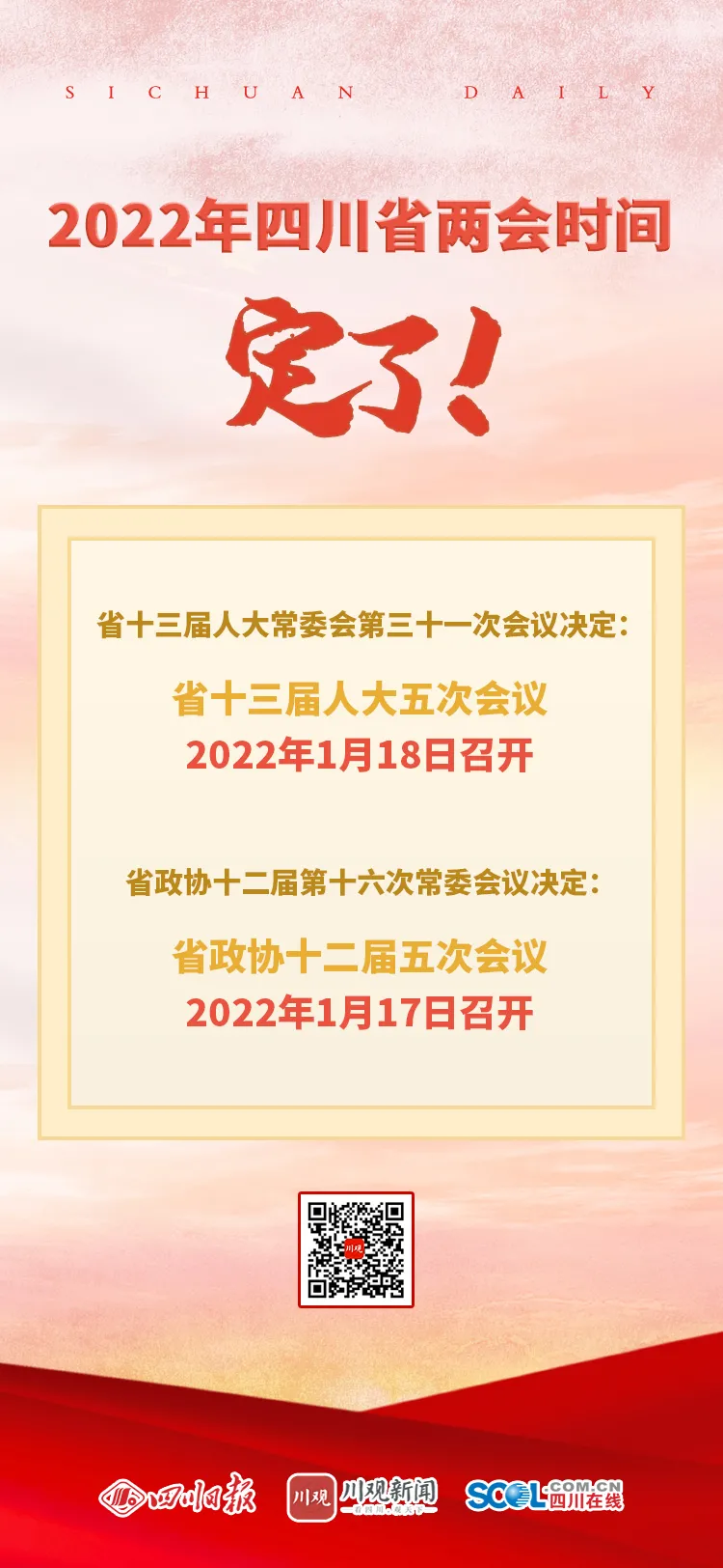 四川省第十三届人民代表大会常务委员会第三十一次会议决定:四川省第十三届人民代表大会第五次会议于2022年1月18日在成都召开,会期预计4天。根据省委关于疫情防控工作部署要求,若需调整大会召开时间,授权主任会议确定。