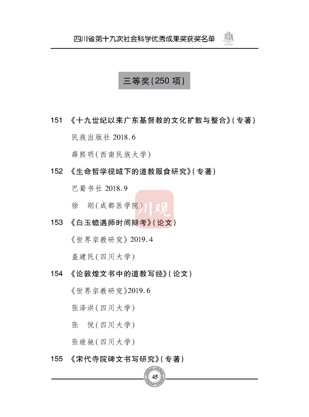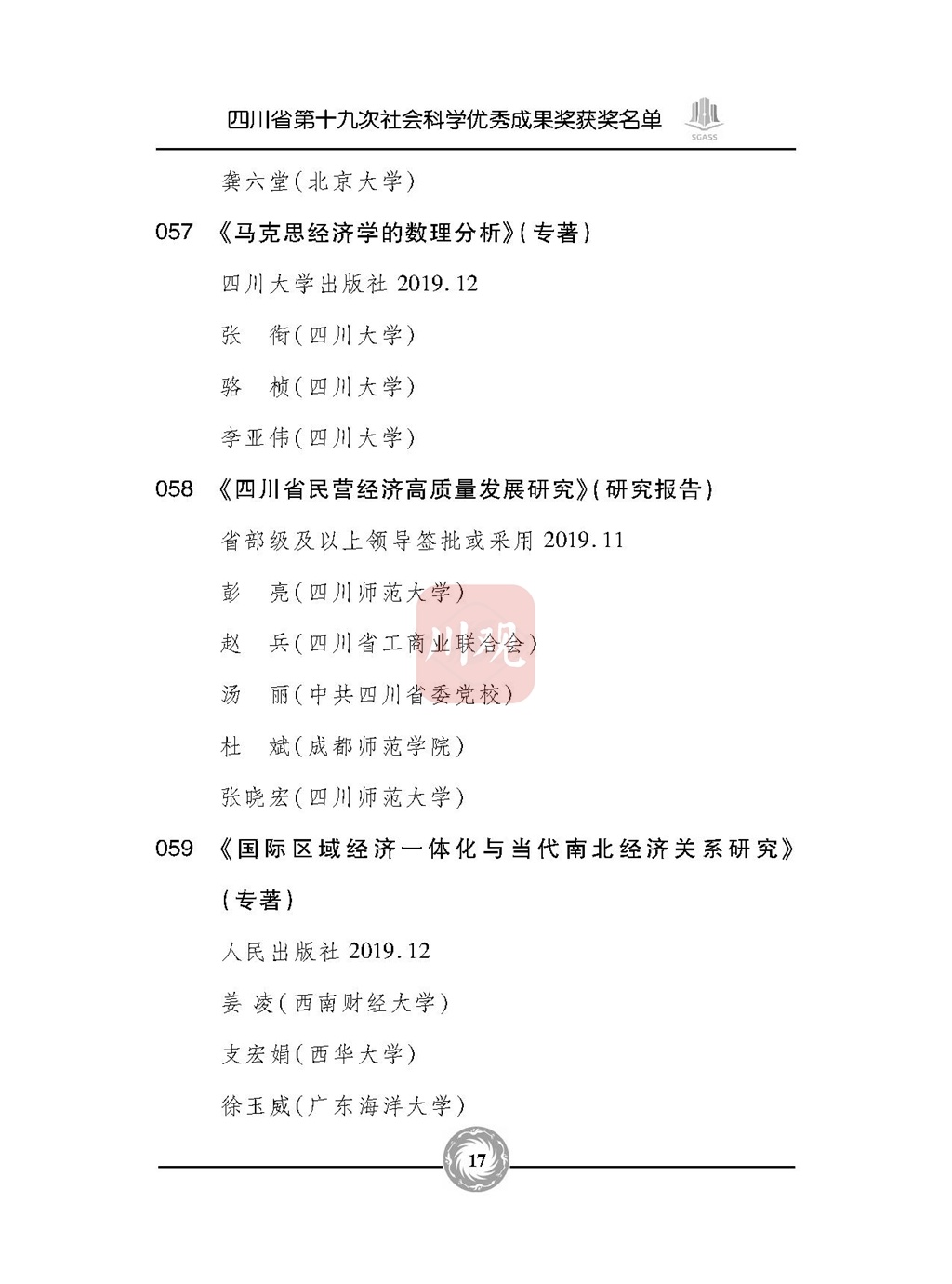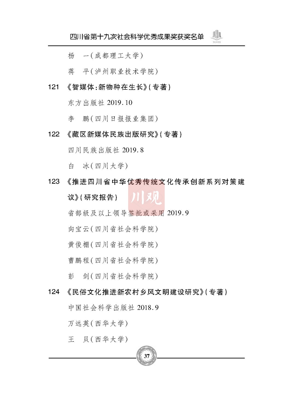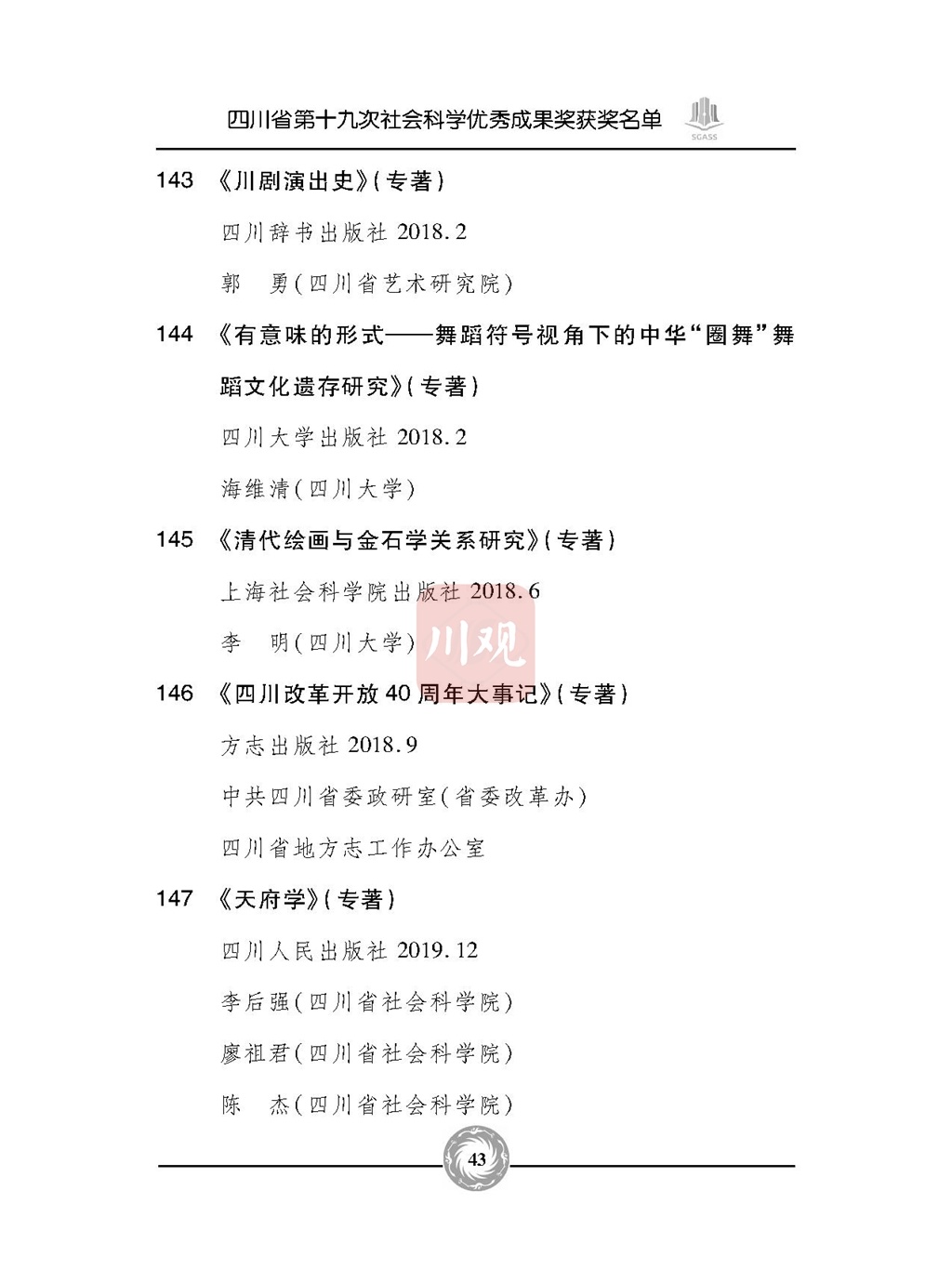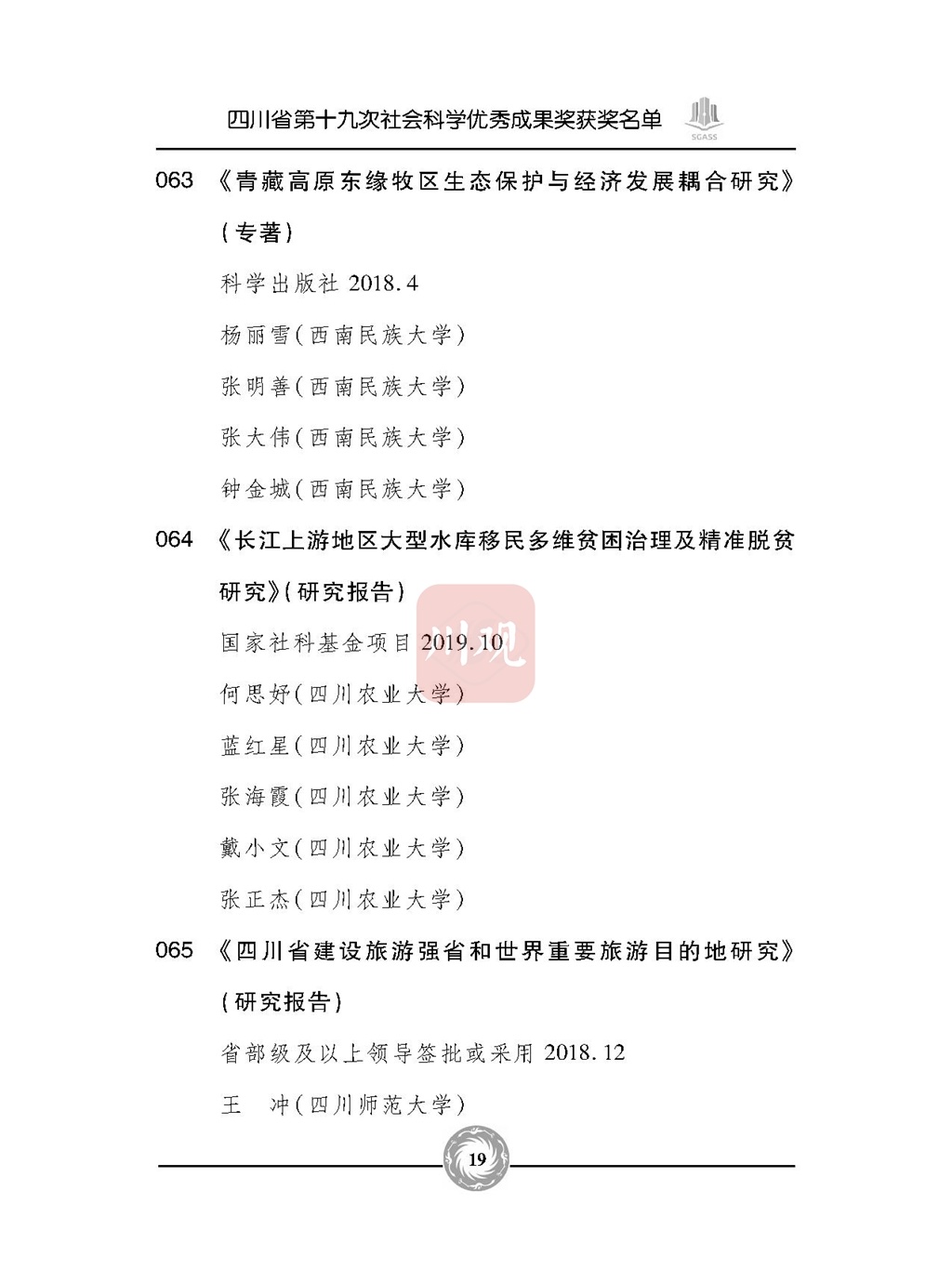 12月27日下午,四川省第十九次社会科学优秀成果奖颁奖大会在成都举行,隆重表彰2018年至2019年社会科学优秀成果,以及为四川省哲学社会科学发展作出突出贡献的专家学者。