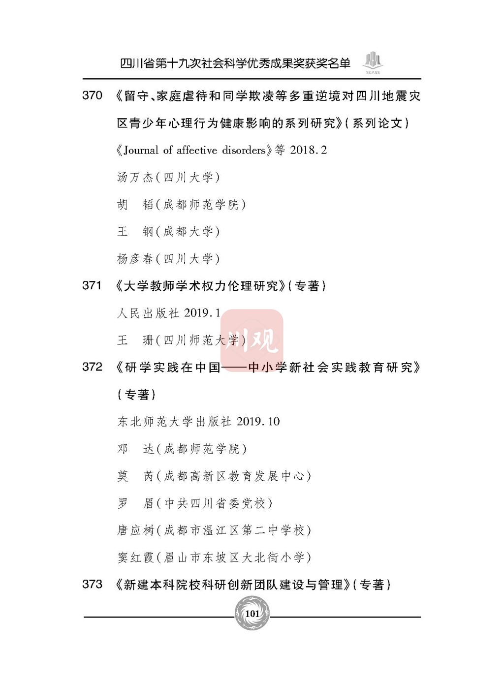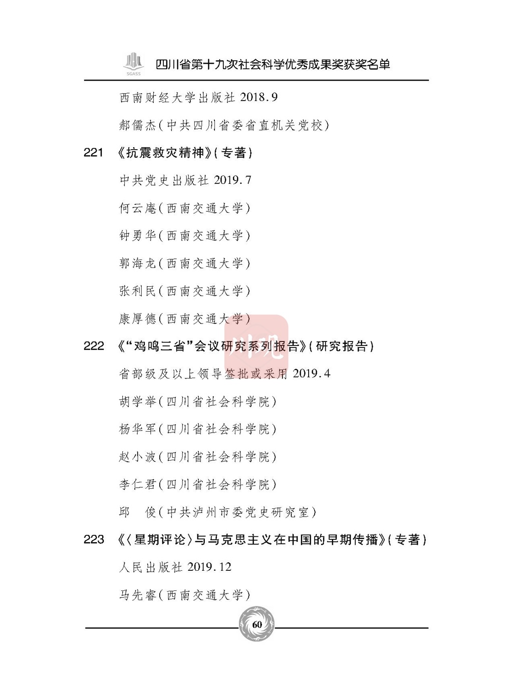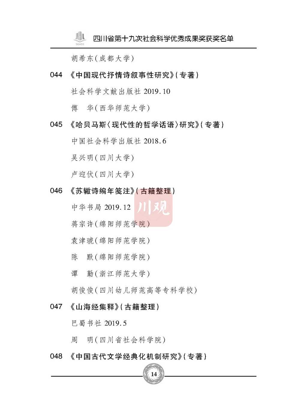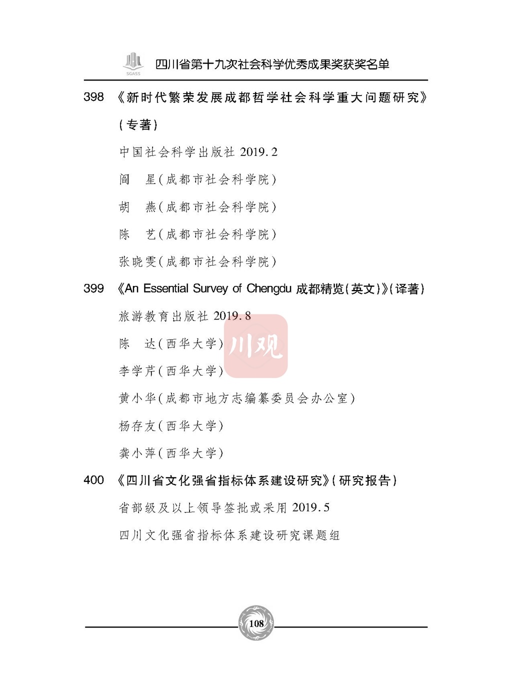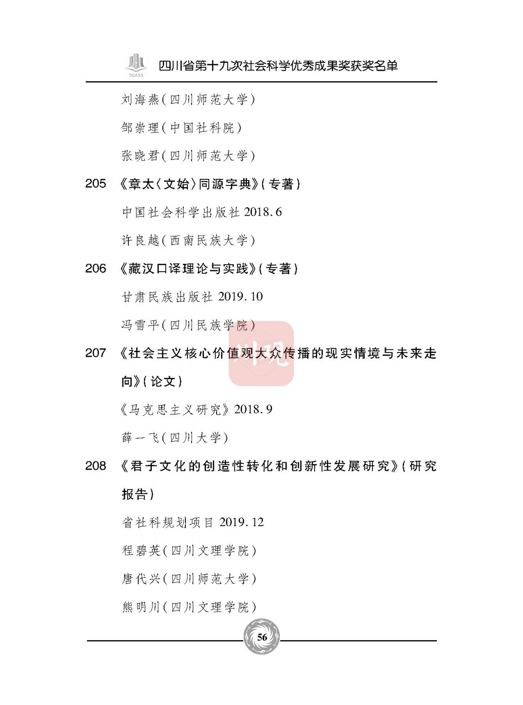 12月27日下午,四川省第十九次社会科学优秀成果奖颁奖大会在成都举行,隆重表彰2018年至2019年社会科学优秀成果,以及为四川省哲学社会科学发展作出突出贡献的专家学者。