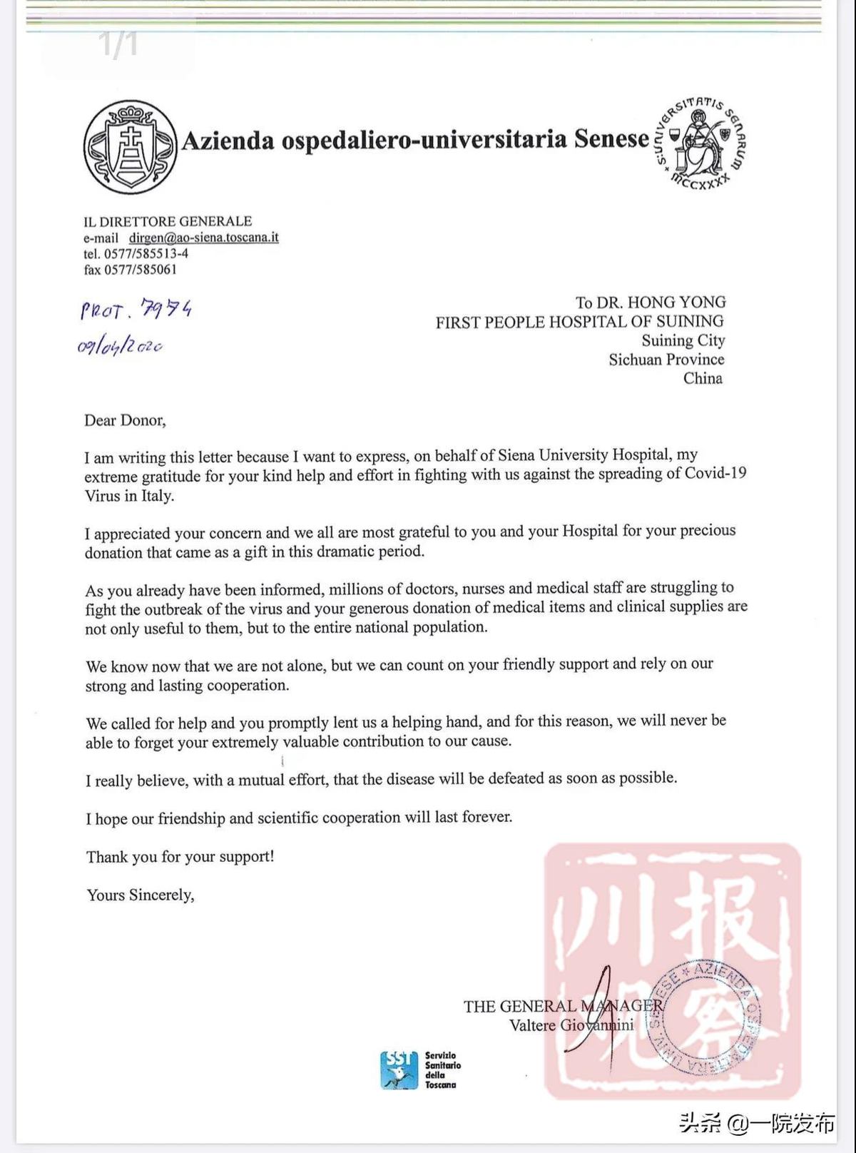 4月16日,黄艳收到一封来自意大利锡耶纳大学医院院长Valtere Giovannini的信。他在邮件中表示:感谢医院(遂宁一院)克服一切困难送达的医用防护物资,这是雪中送碳的珍贵礼物。