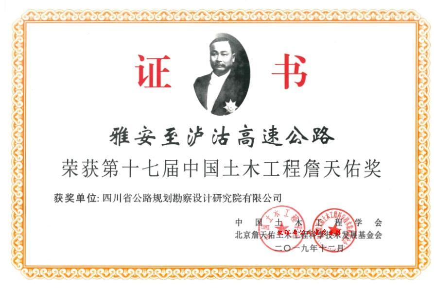 第17届中国土木工程詹天佑奖共有31个工程项目获奖,其中,公路工程两项,雅安至泸沽高速公路夺得一席。