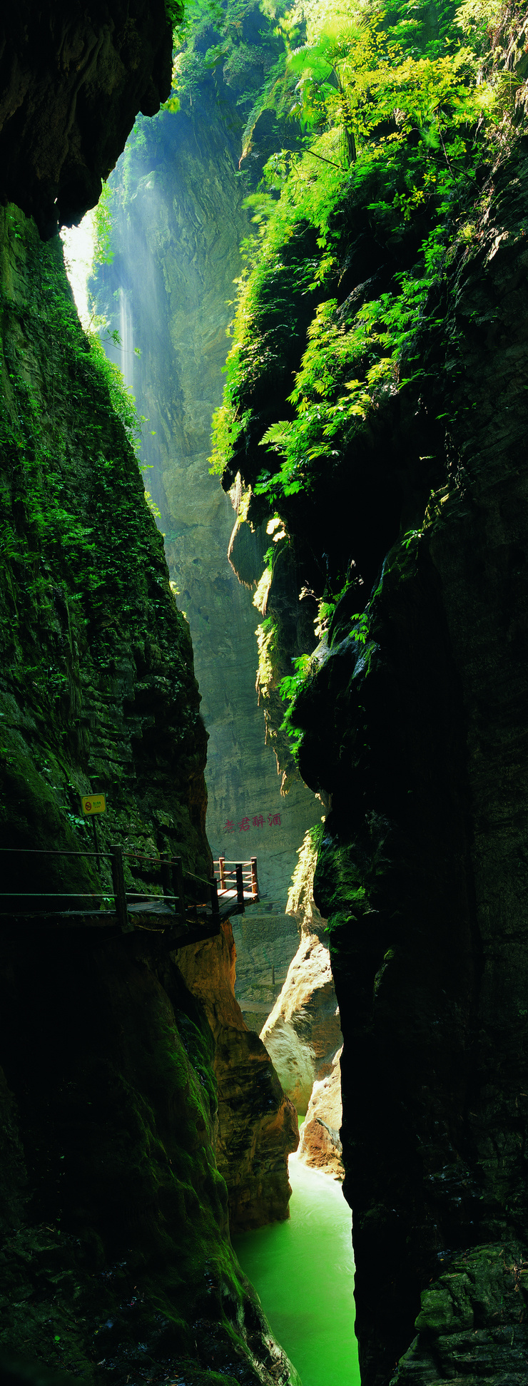金刀峡长约10公里,其中栈道长近7公里。分上下两段。石壁如削,两山岈合,垂直高度超过百米,上有古藤倒挂,下有潺潺流水;下段由于流水侵蚀的作用,有众多洞穴群,潭潭相连,飞泉瀑布层层叠叠,石钟乳、石笋、石柱更是千姿百态。峡内堪称全国最长的峡谷十里仿古木栈道,让人惊叹不已。
