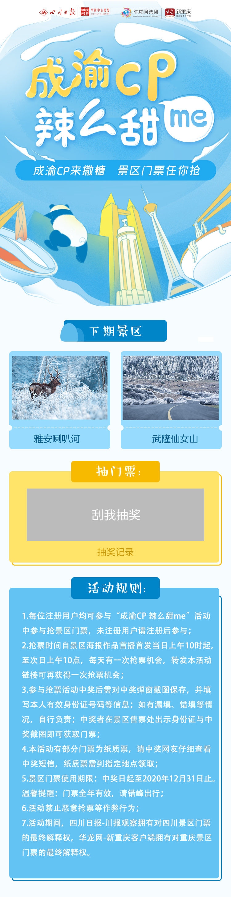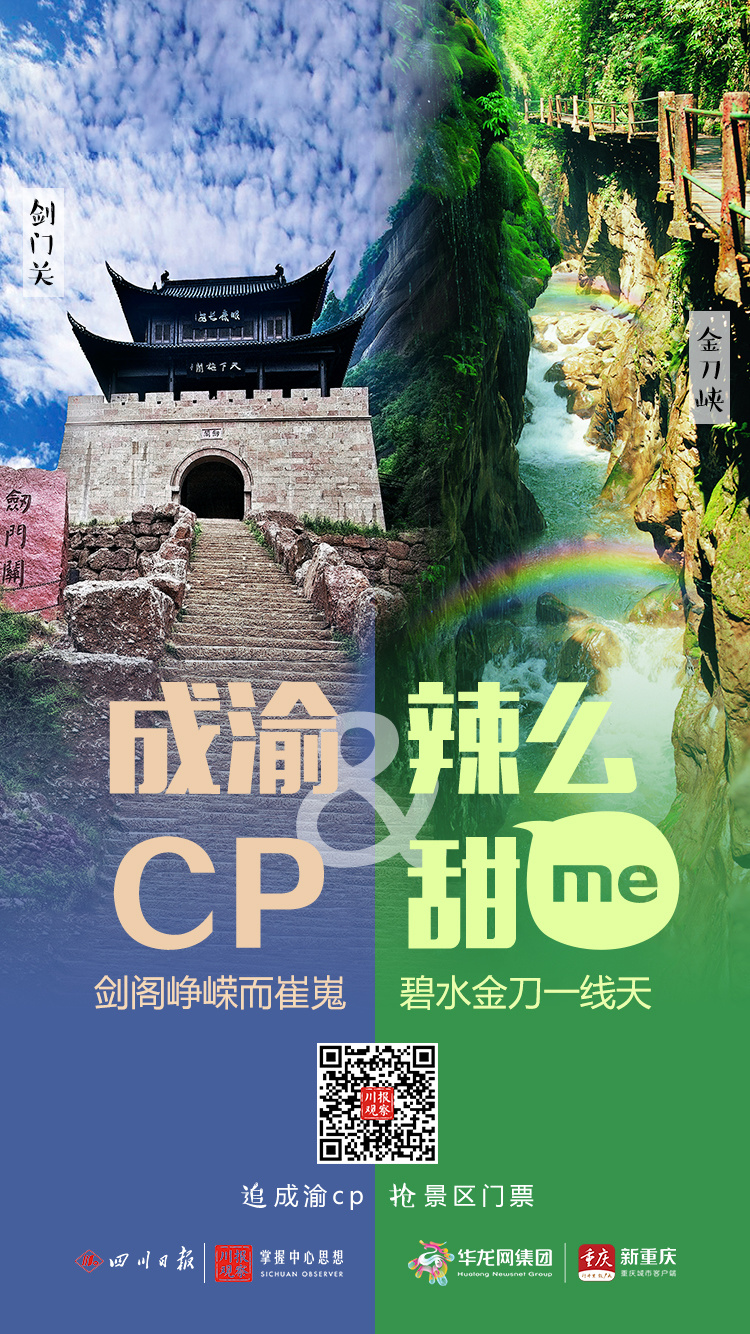 四川日报-川报观察客户端和华龙网-新重庆客户端携手推出“成渝cp 辣么甜me”大型全媒体活动,联动川渝两地知名景区,串联重点文旅体验场景和项目,将免费为网友送出重庆与四川多家知名景区千张门票!