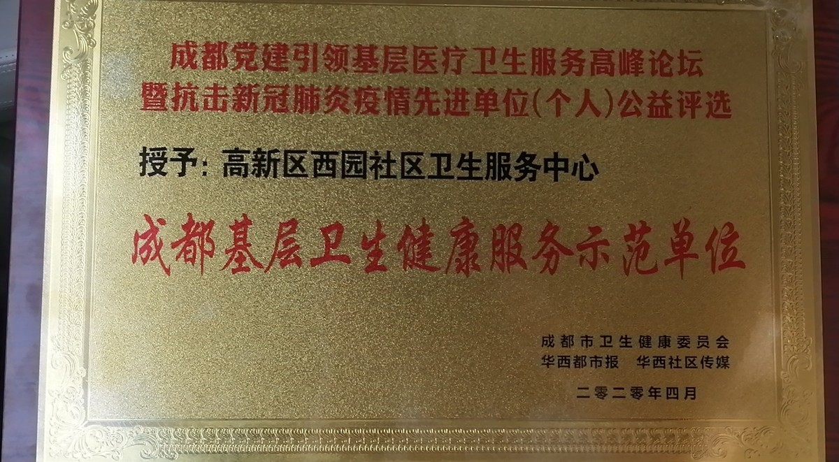 4月28日,由成都市卫健委指导,华西都市报、华西社区传媒联合主办的成都党建引领基层医疗卫生服务高峰论坛暨抗击新冠肺炎疫情先进事迹报告会举行。高新区西园社区卫生服务中心荣获“党建引领·成都基层卫生健康服务示范单位”。