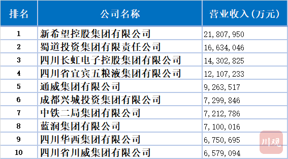 2021年四川有14家四川企业入围中国企业500强,较上年减少1家。新希望控股集团有限公司以21,807,950万元的营收成为进入中国企业500强的四川企业首位,总排名109位,比去年上升25位。其余入围企业名单如下。