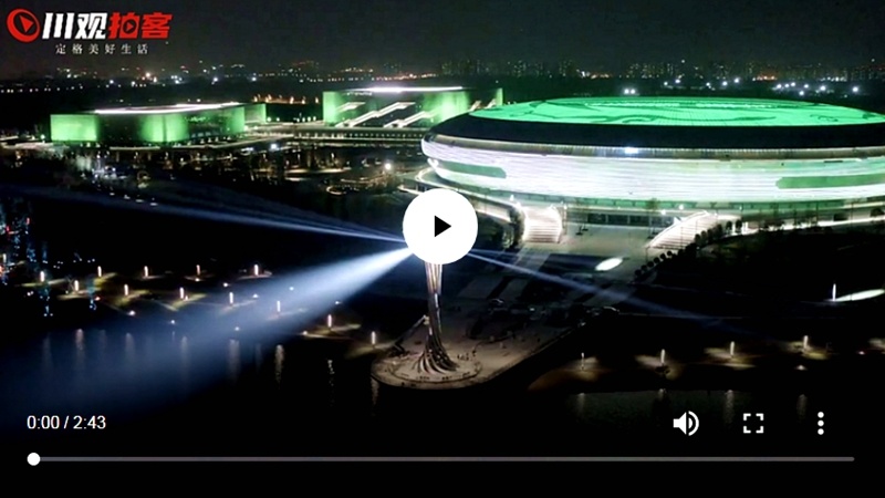 东安湖体育公园主火炬塔“蓉火”进行灯光测试,无人机镜头下的体育公园灯火辉煌,流光溢彩。