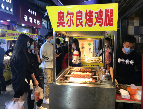 在中心商业区的小吃一条街,记者看到,一到傍晚,小吃街的商户们就纷纷亮起了门头灯,摆出各式各样的特色美食,吸引着不少“好吃嘴儿”前来购买品尝。“现在疫情好转,每天前来小吃街吃东西的人爆满,70后、80后、90后都有。”小吃街商户杨华兵说,为吸引顾客,他最近在抖音上学习了一些小吃的新作法,推出了一系列“新品”供市民选购。