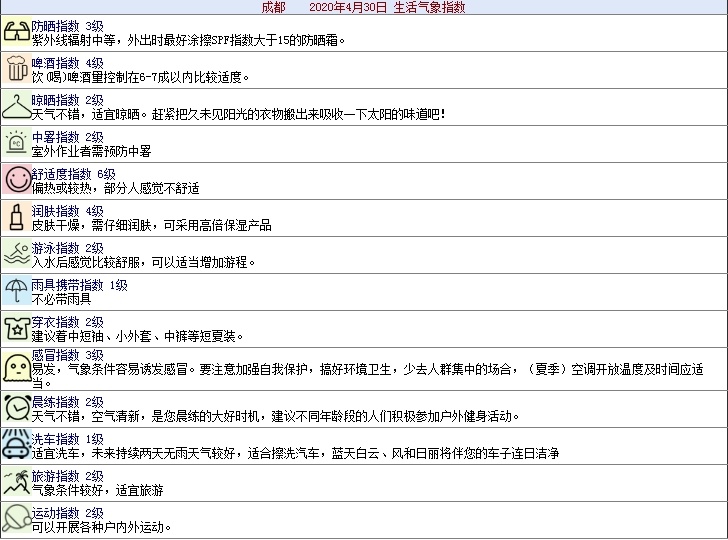 值得提一下的是,四川省气象台预计,五一假期,全省日均最高气温每天都在30℃以上哦~大家可以参考今天的成都生活气象指数,安排好外出需要准备的物品。