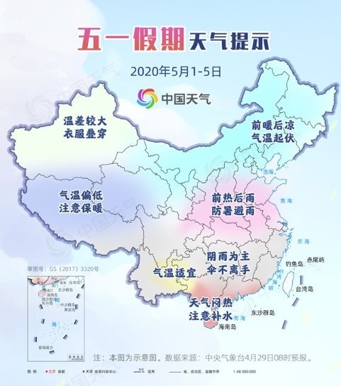 中央气象台预计,今年”五一”期间(5月1日至5日)全国大部分地区气象条件总体较好,华北南部、黄淮等地前期有高温晴热天气,江南、华南北部及贵州多阴雨。气温起伏,阴晴多变,外出郊游外套、短袖、雨伞、防晒、口罩一个不能少。