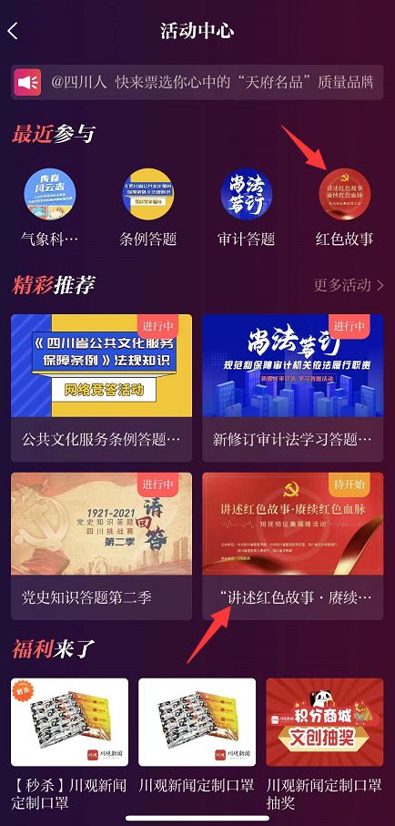 2、【打开川观新闻客户端】→【我的】→【活动中心】
