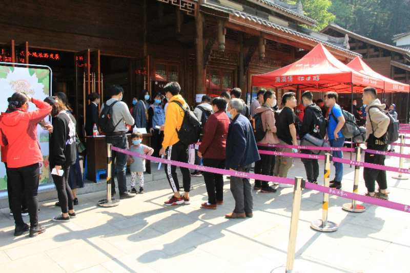 5月1日上午10点,位于巴中市南江县的光雾山旅游景区门口,戴着口罩的游客已排起长龙。出示“健康绿码”、接受体温检测、核验景区门票后,游客经过“人工登记通道”有序进入景区。