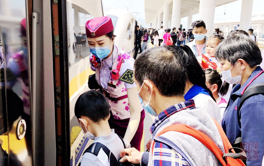 “五一”黄金周,川渝贵环线动车迎来首个假期大客流。5月2日清晨6点,川渝贵环线高铁C6017次列车长韩继童和班组同事在成都东站公寓准时起床,化妆整理,7点来到站台,列车长韩继童的五一“跑圈”工作正式开始了。