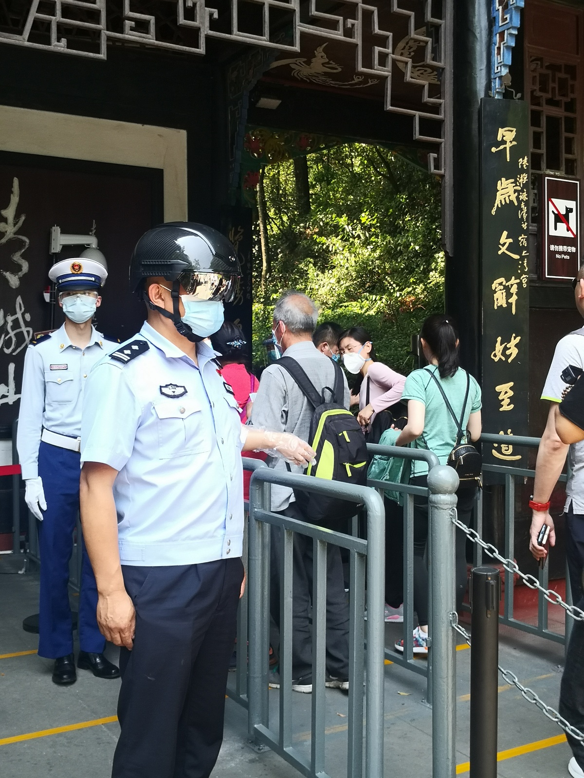 排队的栏杆上,每隔1米就贴有一个黄色的标记,不时有语音提示游客,检票时提前准备好身份证、健康码,加快通行效率。进入景区,除了宫观庙宇以外,公共区域处已全部开放。 游客较前几日多了不少,有的是一家几口,有的是一个旅行团。随处可见戴着红袖章的工作人员,不时提醒游客戴好口罩,分散游览。