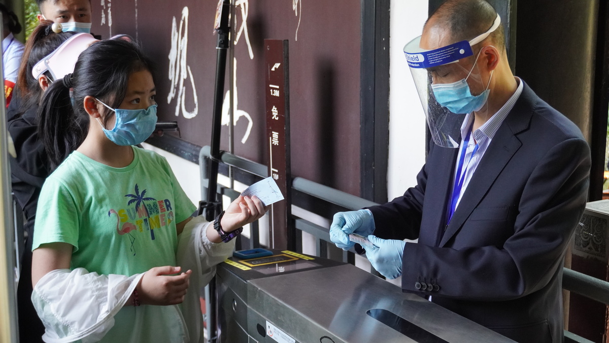 他与工作人员将引导排队的回型栏杆从检票入口处向外延伸了几十米,“这样可以减轻入口处人流聚集的压力”。记者排队大约5分钟后,到达检票口。拿出提前申请的健康码,刷身份证,几秒钟就顺利进入景区。