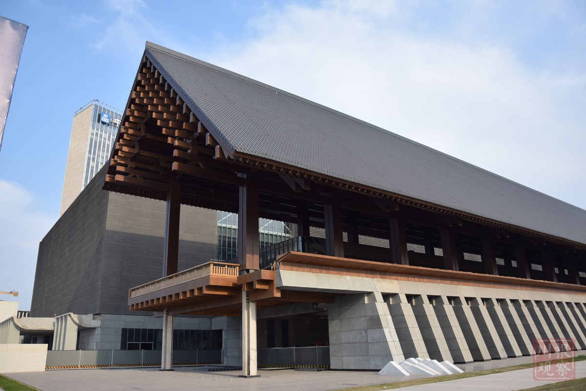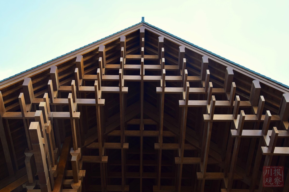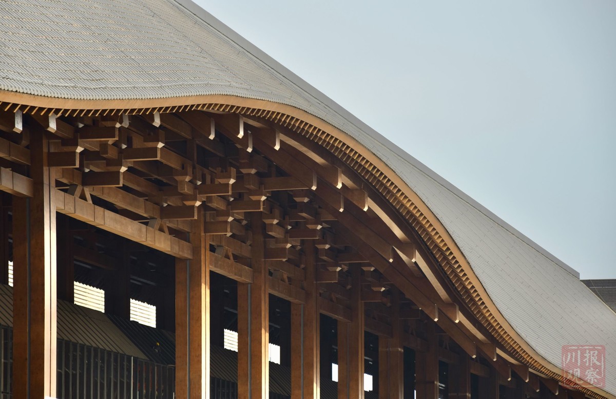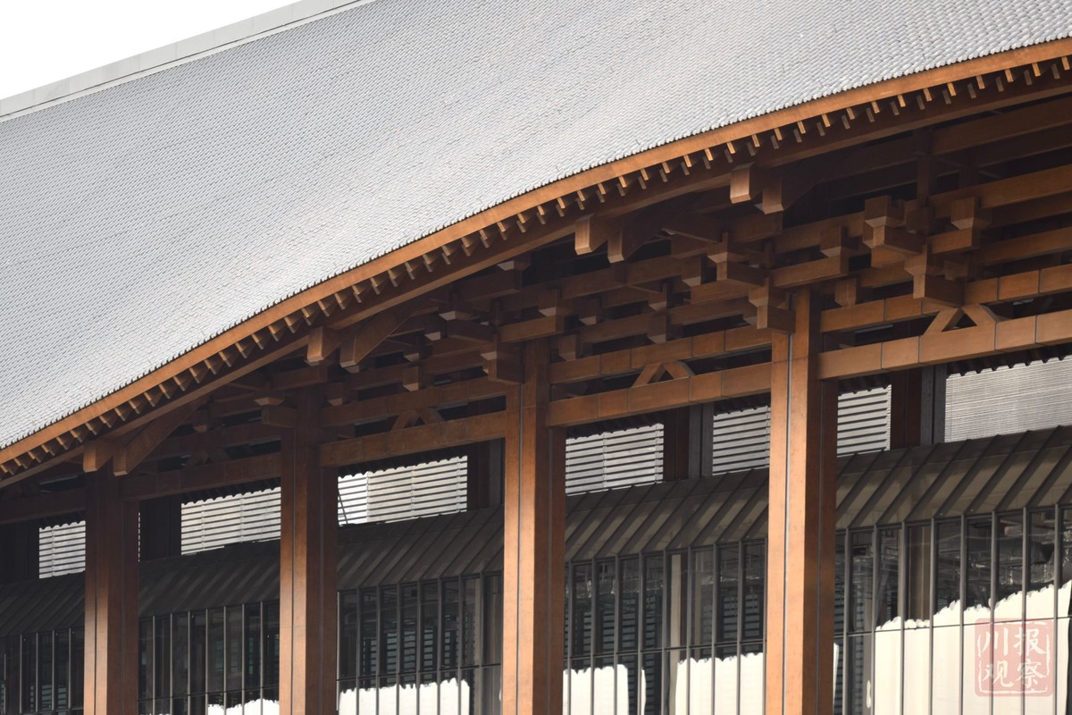 会议中心的前厅木结构檐廊高24米,柱跨宽16米,为钢木混合结构长廊,其中,胶合木用量超过4500立方米,为亚洲最大单体木结构建筑。借鉴传统建筑中抬梁式木结构、明堂、制式等设计理念和元素,采用抬梁式构架,端头出挑,展露木结构榫卯构件,再现中国传统建筑精髓,这也是“天府之檐”这个名字的由来。