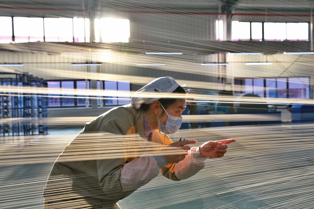 1月12日,恒力(泸州)产业园纺织项目一期的分条整机车间,工人正在检查丝线是否正常。 郭荞璐 摄