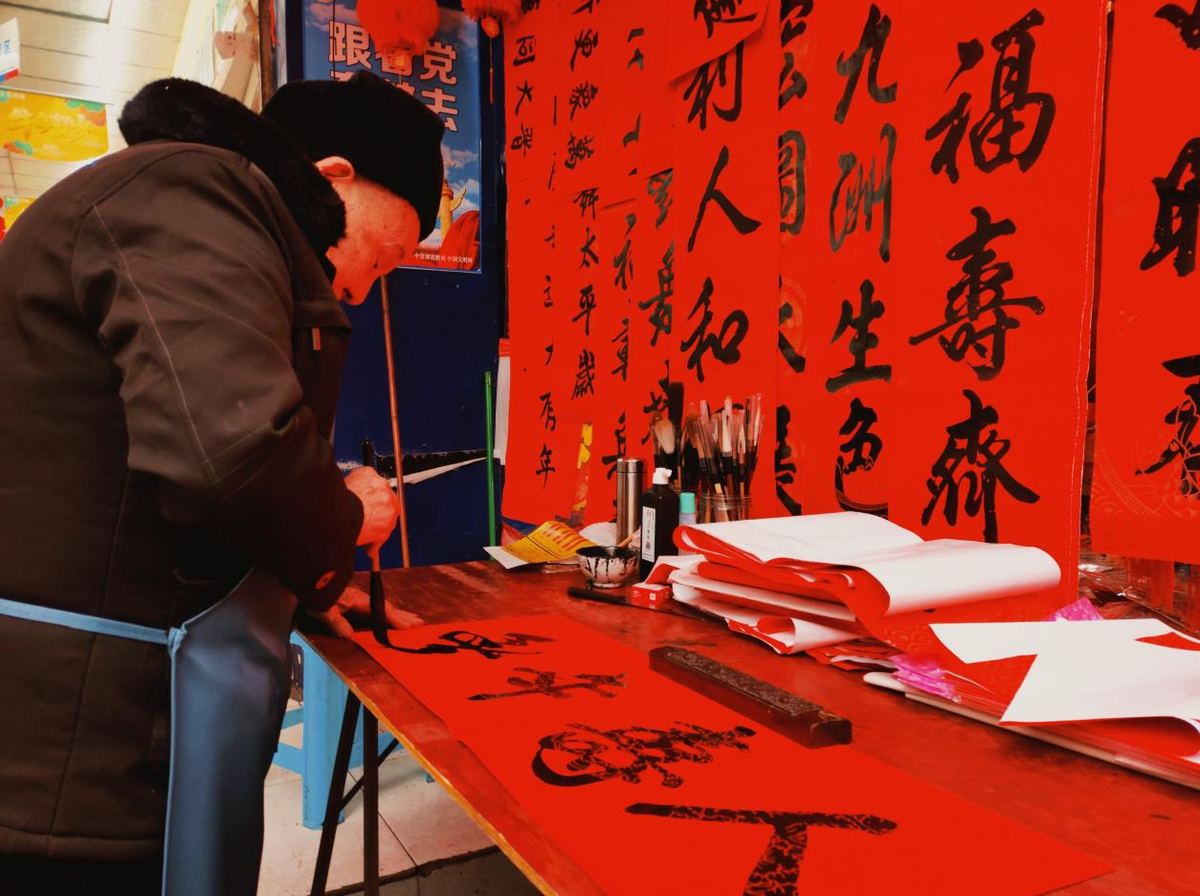 春节前夕,老人正在手写春联。龙欣雨 摄