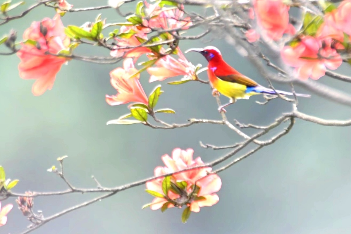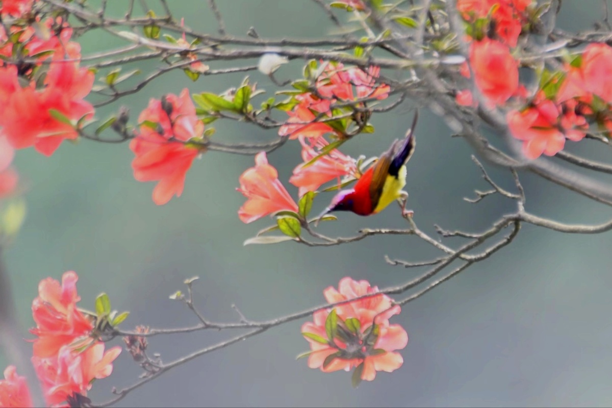 5月,泸州市古蔺县黄荆老林漫山遍野的映山红,美的令人赏心悦目,同时也是蓝喉太阳鸟最活跃的时节。艾鸿 徐挺 摄