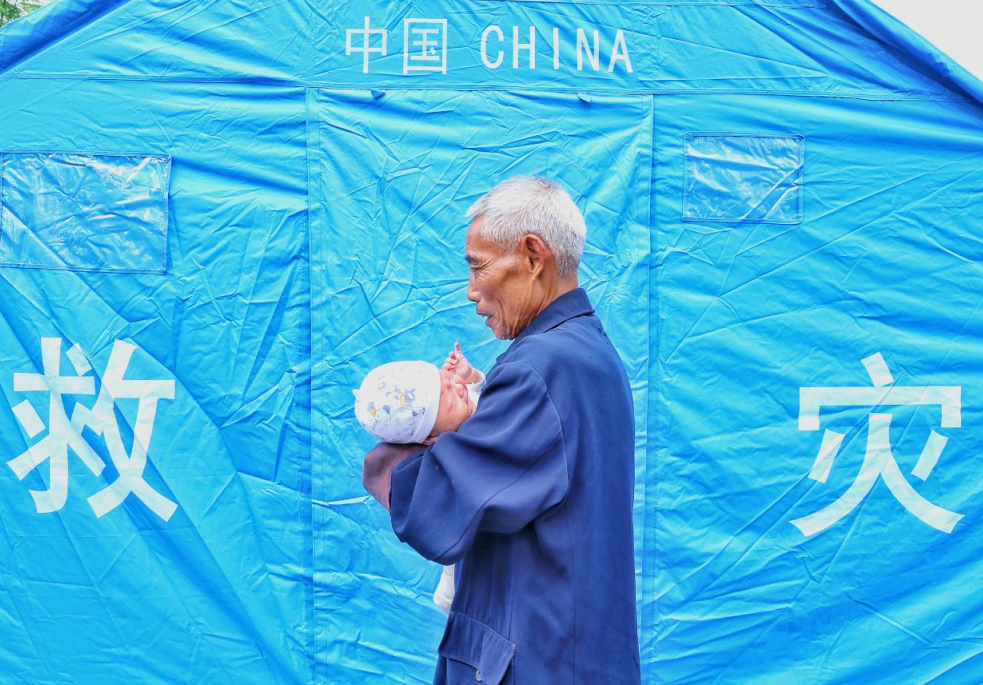 9日16月泸县地震,在安置点内,老人抱着婴儿。周梦颖 摄