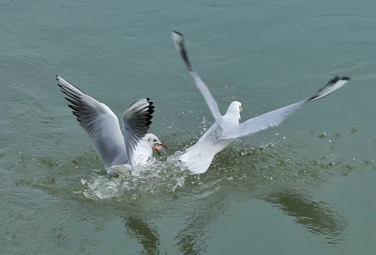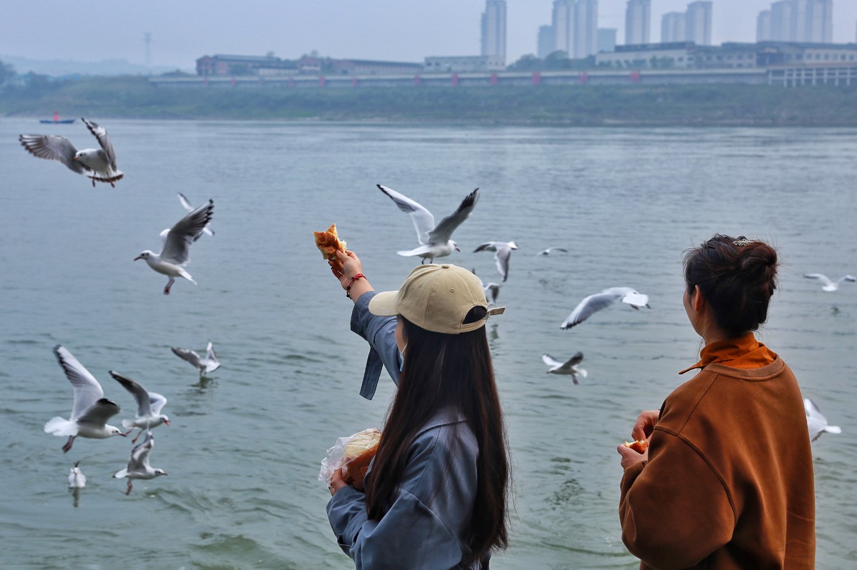 11月5日,泸州江阳区东门口,成群的红嘴鸥盘旋在江面上空,四周围观的群众有的拿着馒头,有的拿着面包,往空中投喂给红嘴鸥们吃。周梦颖 摄