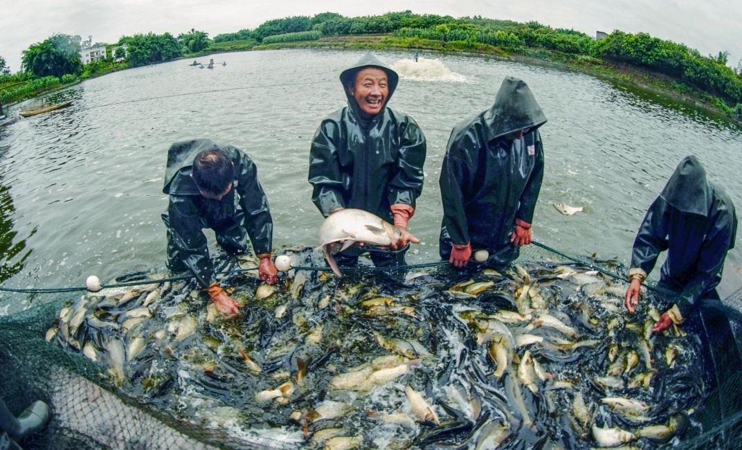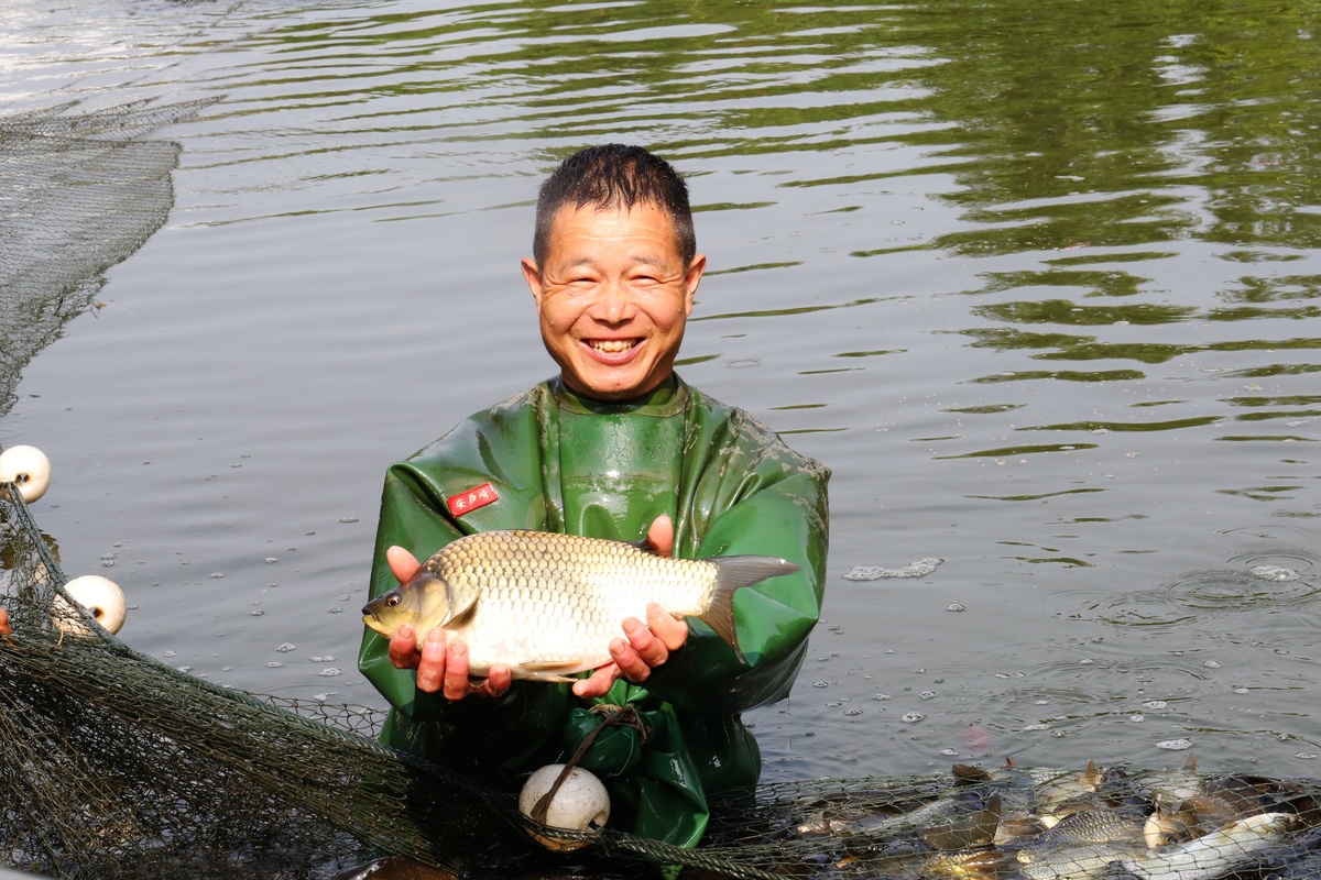 5月19日,在四川省泸州市龙马潭区双加镇十里渔湾内,大春渔业合作社的村民们正在鱼塘内拉网打渔,进行新一轮渔业生产作业。杨尚威 摄