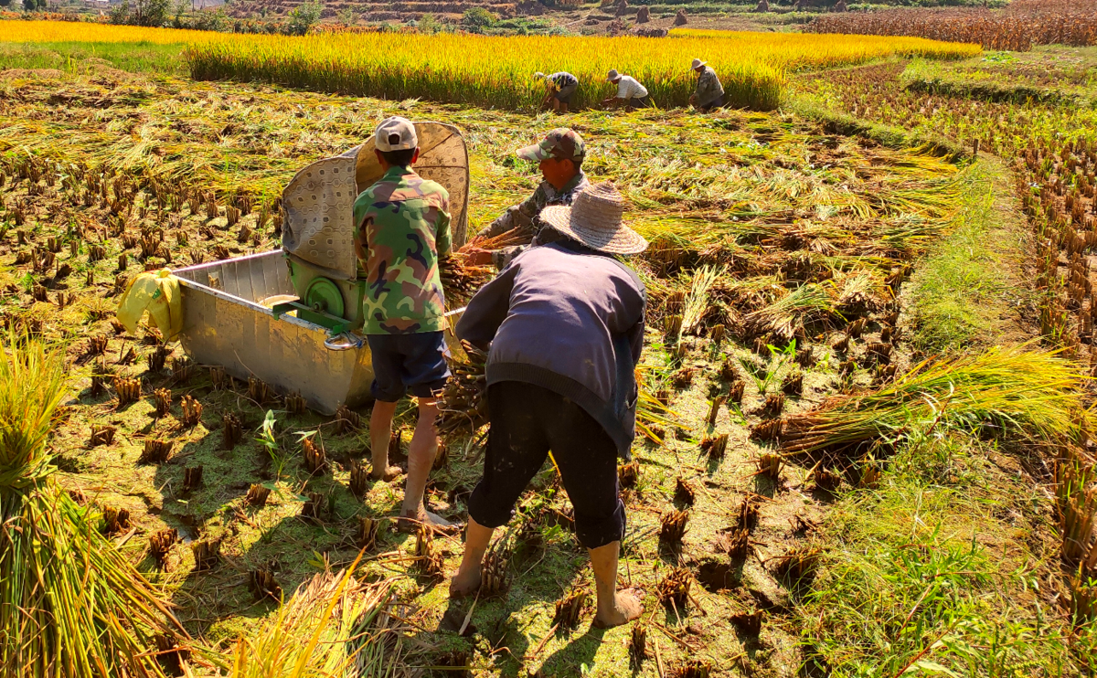 9月23日,中国农民丰收节当天,泸州市古蔺县村民正在收割稻谷。龙欣雨 摄