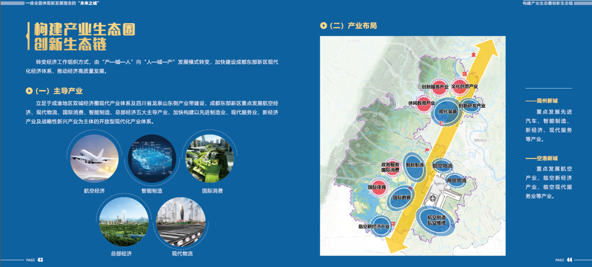 ——简州新城:集聚创新研发、智能制造、商务办公、特色文创功能,建设以成都东部新区铁路枢纽站为核心的成渝地区双城经济圈开放创新服务平台,以新经济为引领的商业商务、生活服务、文化教育中心,以先进汽车产业为支撑的现代制造基地。