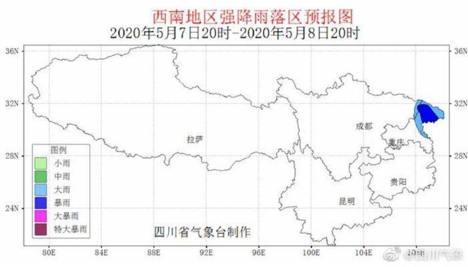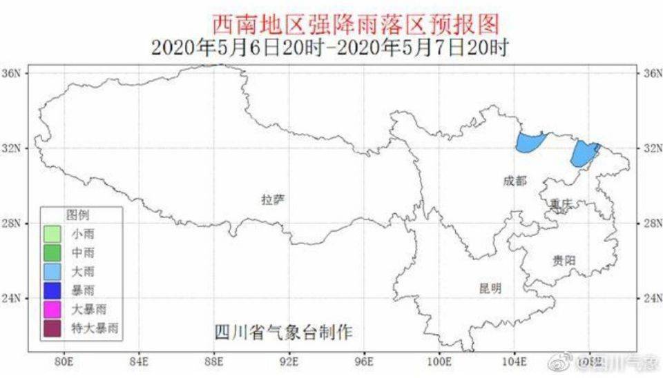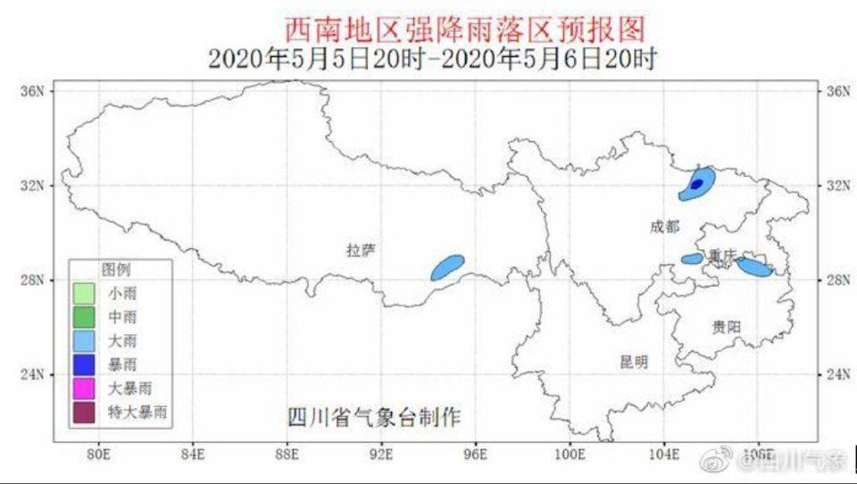 5月5日20时到6日20时,四川盆地南部和西北部、贵州东北部、西藏东南部有大雨,局部暴雨。