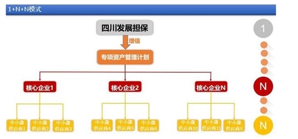 该模式也被称为供应链融资的“1+N+N”模式。“1”是指四川发展担保公司以牵头人、担保人身份,联合中信证券、腾讯旗下联易融科技公司等专业机构发起的专项资产管理计划。“N”是指具有延长应付账款需求的N户核心企业。“N”是指供应链中的N个中小微企业。