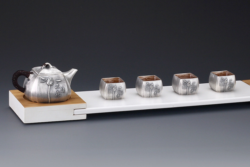 斗笠盖碗:茶盖镶嵌金属装饰,在传统青花基础上拥有现代感、时尚感。同时,青花红心,与茶船呼应,颜色统一完整。茶碗直线延伸设计,使之相较其他盖碗设计更加硬朗,茶船回归唐代木质材料,采用圆弧柔和碗身。