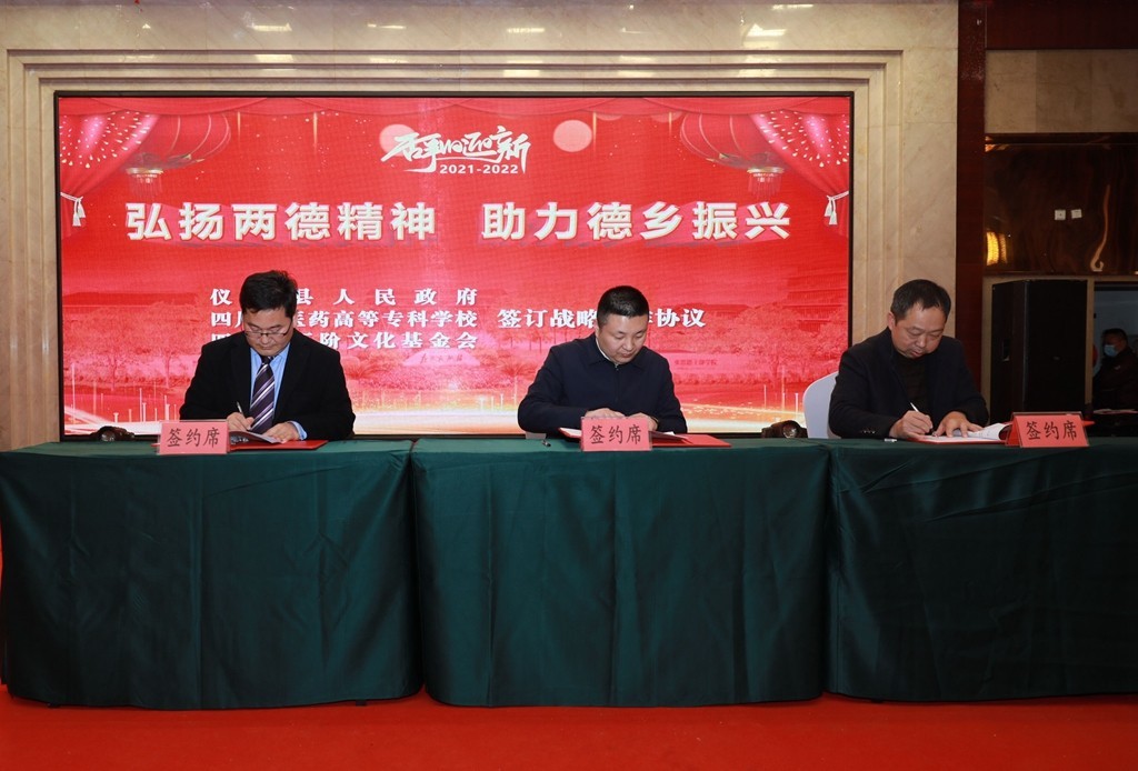 2021年12月31日,四川中医药高等专科学校、四川南充市仪陇县人民政府、四川省玉阶文化基金会在仪陇县签订了战略合作协议,积极拓展科教、产业、社会等领域全方位深度合作,致力建设立足仪陇、面向全省的产教融合教学实践基地和中医药产业开发体系,促进医药卫生事业发展,助推中医药文化传承和红色文化传播,进一步助推“健康四川”“乡村振兴”等战略的实施,打造校地企合作新典范。