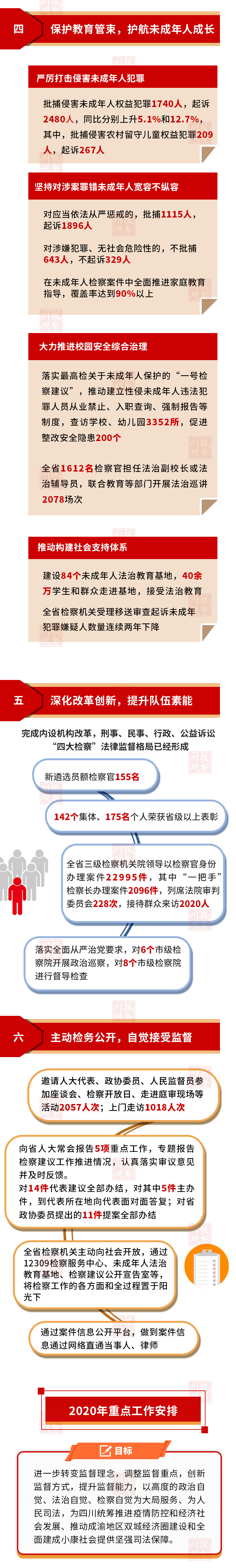 围绕中心工作,践行初心使命;更新监督理念,做到客观公正;推进“四大检察”,落实为民司法;保护教育管束,护航未成年人成长;深化改革创新,提升队伍素能;主动检务公开,自觉接受监督……报告从六个方面梳理了去年四川检察工作的重点和亮点。这些检察工作给四川经济社会发展提供了怎样的法治保障?给四川百姓带来了哪些法治福利?
