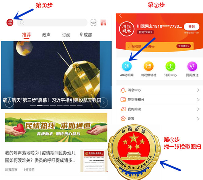 此外,川报观察还特别推出“实景AR扫描读报告”(AR扫描说明图在文末)功能,参会的人大代表、政协委员只要拿出各自的出席证,社会公众找到检察院的检徽图案,然后下载川报观察客户端,使用其中的“AR动新闻”功能扫描参会证、检徽,便可用更具科技感的方式浏览检察院工作报告的动画视频啦!