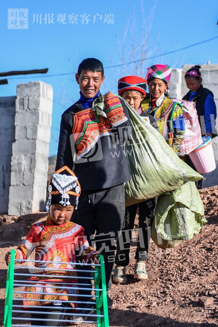 2月11日清晨,凉山州昭觉县三岔河乡三河村村民吉好也求一家人带着行李准备搬往新居。川报观察记者 杨树 摄