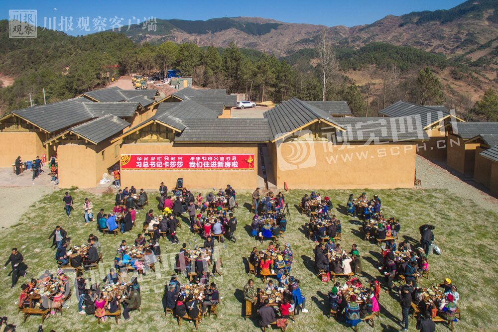 2019年2月11日,三河村首批29户搬入易地扶贫安置点的新家。为庆祝乔迁之喜,当地干部群众集体举行坝坝筵。