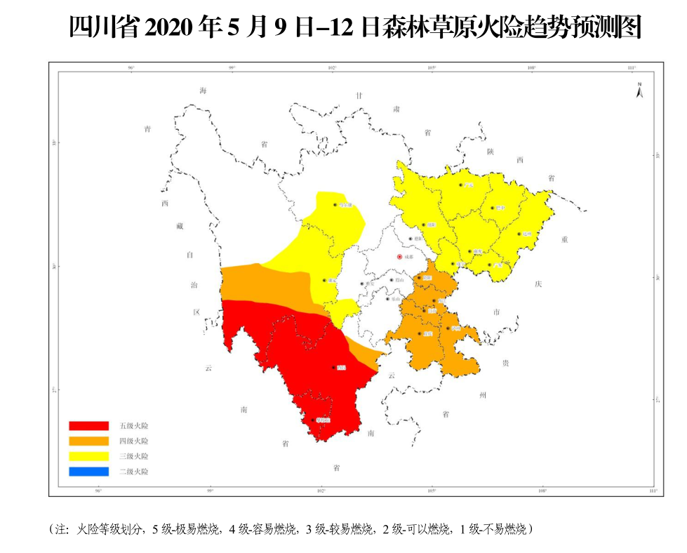 据气象部门预测,2020年5 月9 日至12日,自贡市、泸州市、内江市、资阳市、宜宾市部分地区,甘孜州中南部,凉山州大部及攀枝花市以多云天气为主,有效降雨稀少,气温高、风力大。综合气象、森林草原可燃物载量、林区牧区物候及前期森林草原火灾发生情况分析:盆地中南部,甘孜州中南部,凉山州大部,攀枝花市全境的主要林区牧区森林草原火险等级可达4~5 级。