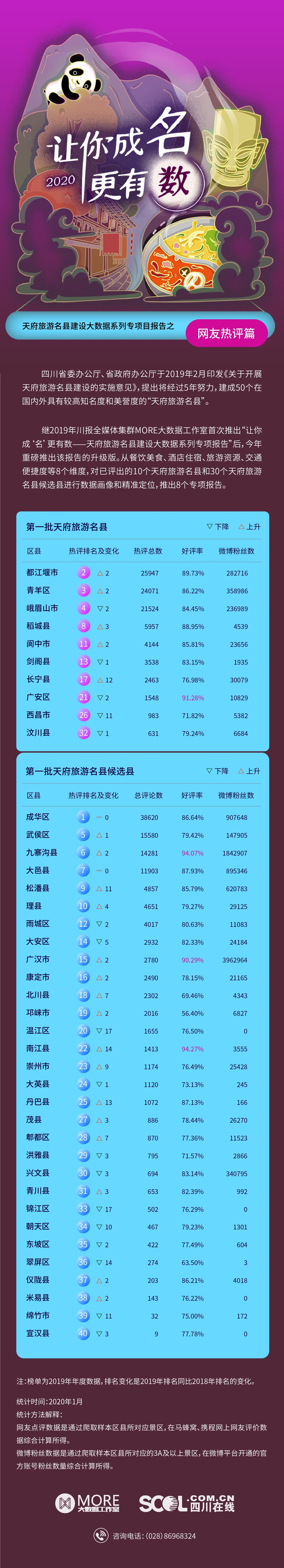 为助力天府旅游名县建设,川报全媒体集群MORE大数据工作室重磅推出“2020·让你成‘名’更有数——天府旅游名县建设大数据系列专项报告”。经过一年角逐,哪些区县有进步?哪些领域有发展?MORE大数据工作室将通过餐饮美食、酒店住宿、旅游资源等8个维度告诉你答案!今天,为大家带来的是“2020·让你成‘名’更有数”之网友热评篇。