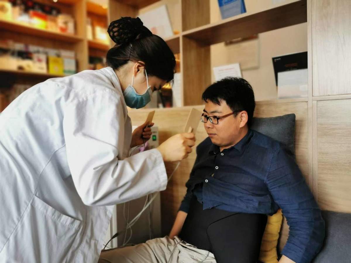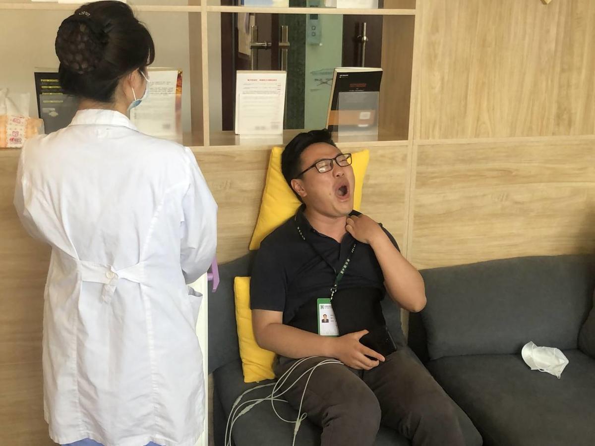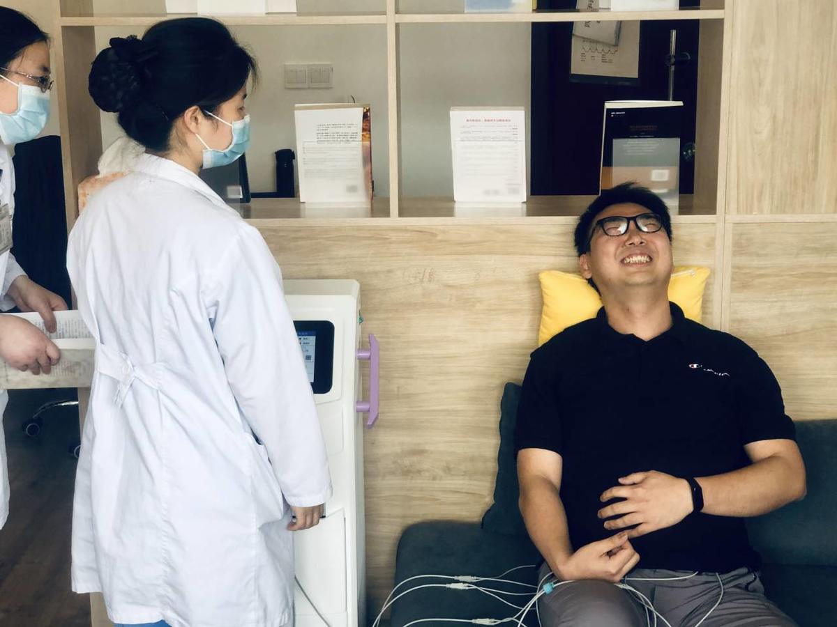 随后,男性职工坐上分娩阵痛体验仪器,通过电流刺激腹部来模仿分娩阵痛,让体验者感受到“分娩”的痛感。