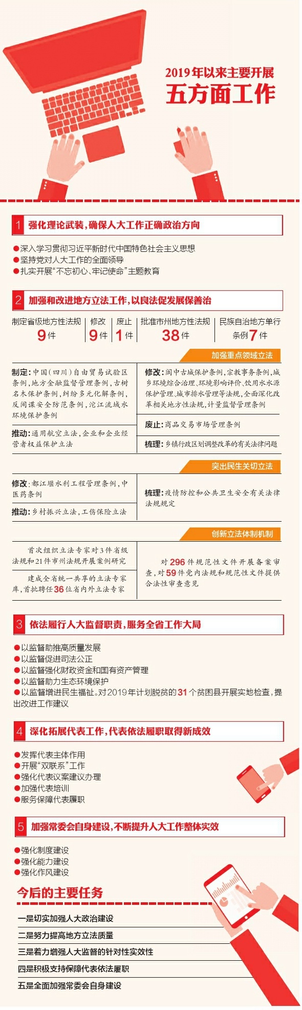 省十三届人大二次会议以来,省人大常委会紧扣全省工作大局和省委关于地方立法工作的部署,坚持科学立法、民主立法、依法立法,统筹做好立改废释工作。制定省级地方性法规9件、修改9件、废止1件,批准市州地方性法规38件、民族自治地方单行条例7件,为治蜀兴川提供了法治保障。