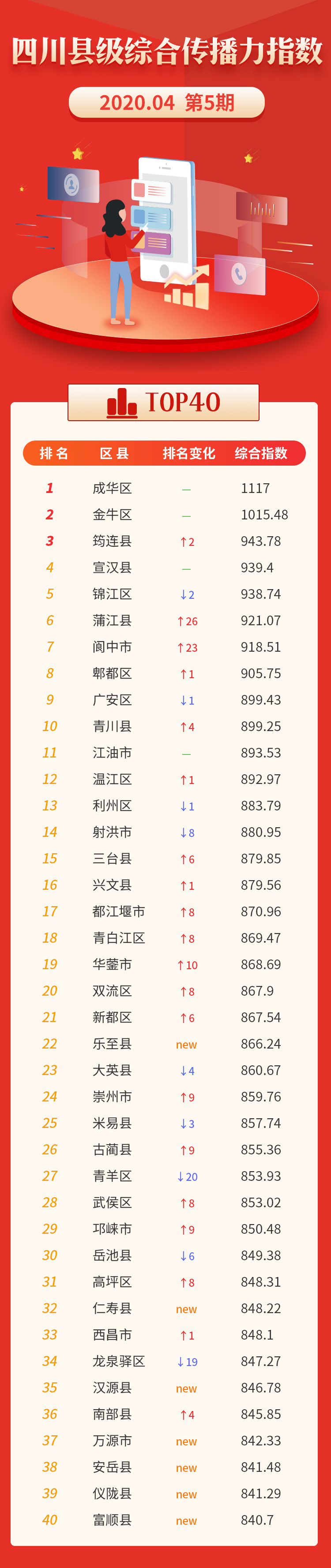 5月11日,四川县级综合传播力指数第5期(2020年4月)发布。本期指数的数据采集时间段是2020年4月1日至4月30日,共涉及3万余个有效活跃账号、84.8万篇文章。