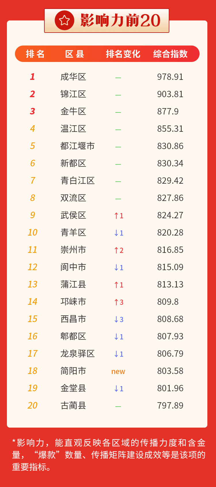 从影响力前20名统计结果看,前10名排名的浮动较小,成都简阳市是新入围县(市、区)。成都成华区蝉联第一;成都邛崃市上升幅度最大。