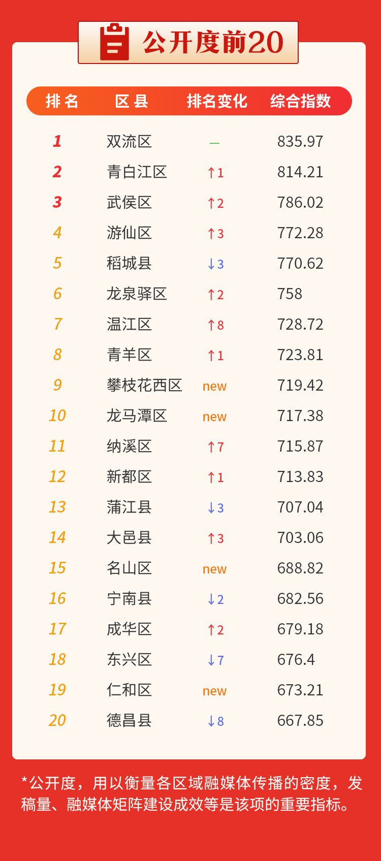 从公开度前20名统计结果看,新入围县(市、区)4个(占比20%),其中攀枝花西区排名最高(第9名)。双流区蝉联第一,其次为成都的青白江区和武侯区、绵阳的游仙区、甘孜州的稻城县。成都温江区排名上升最多,从上月的第15名升至本月第7名;泸州的纳溪区排名上升较多。