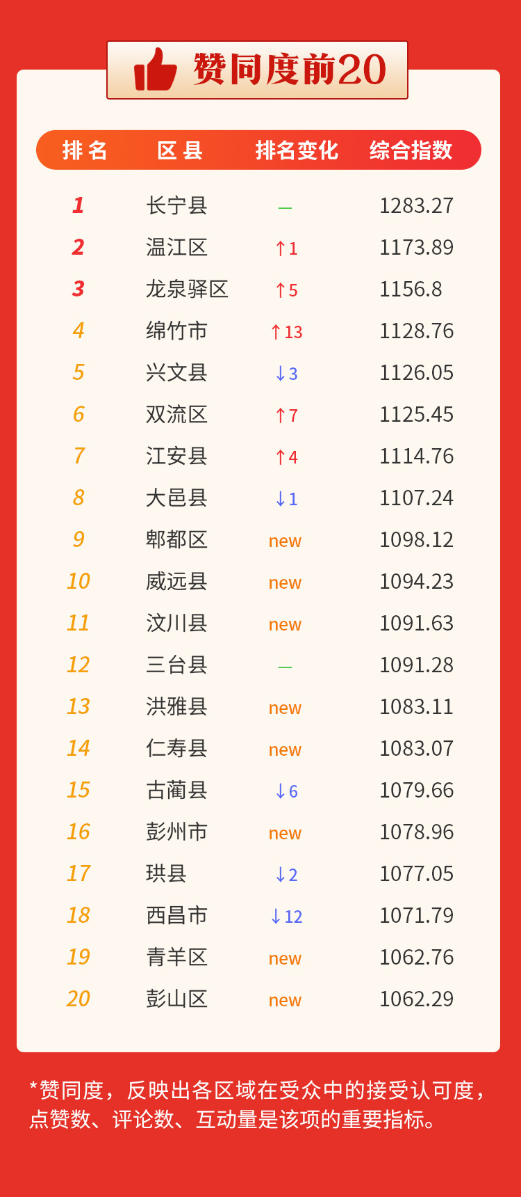 从赞同度前20名统计结果看,新入围县(市、区)8个(占比40%),集中在中下游,其中成都的郫都区排名最高(第9名)。宜宾长宁县蝉联第一,其次为成都的温江区和龙泉驿区、德阳的绵竹市、宜宾的兴文县。德阳的绵竹市排名上升13名,幅度最大。