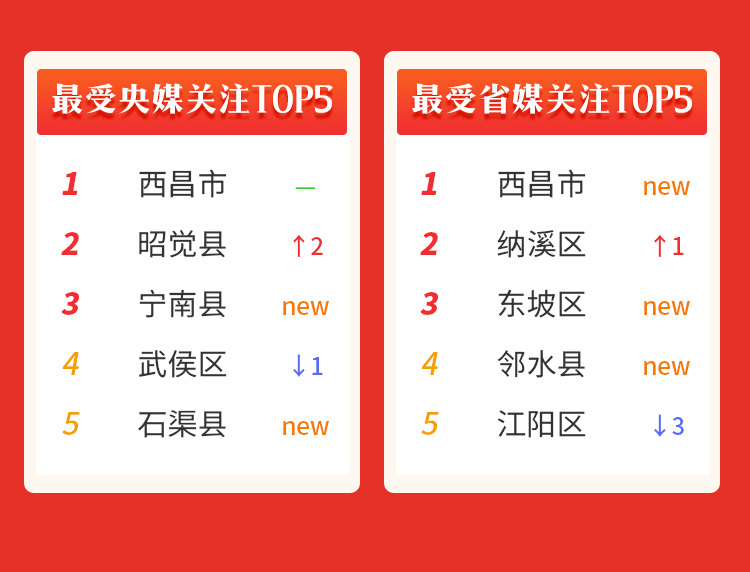 在央媒和省媒关注榜中,凉山的西昌市、昭觉县、宁南县,成都的武侯区,甘孜的石渠县名列最受央媒关注前5名;凉山的西昌市、泸州的纳溪区、眉山的东坡区、广安的邻水县、泸州的江阳区名列最受省媒关注前5名。