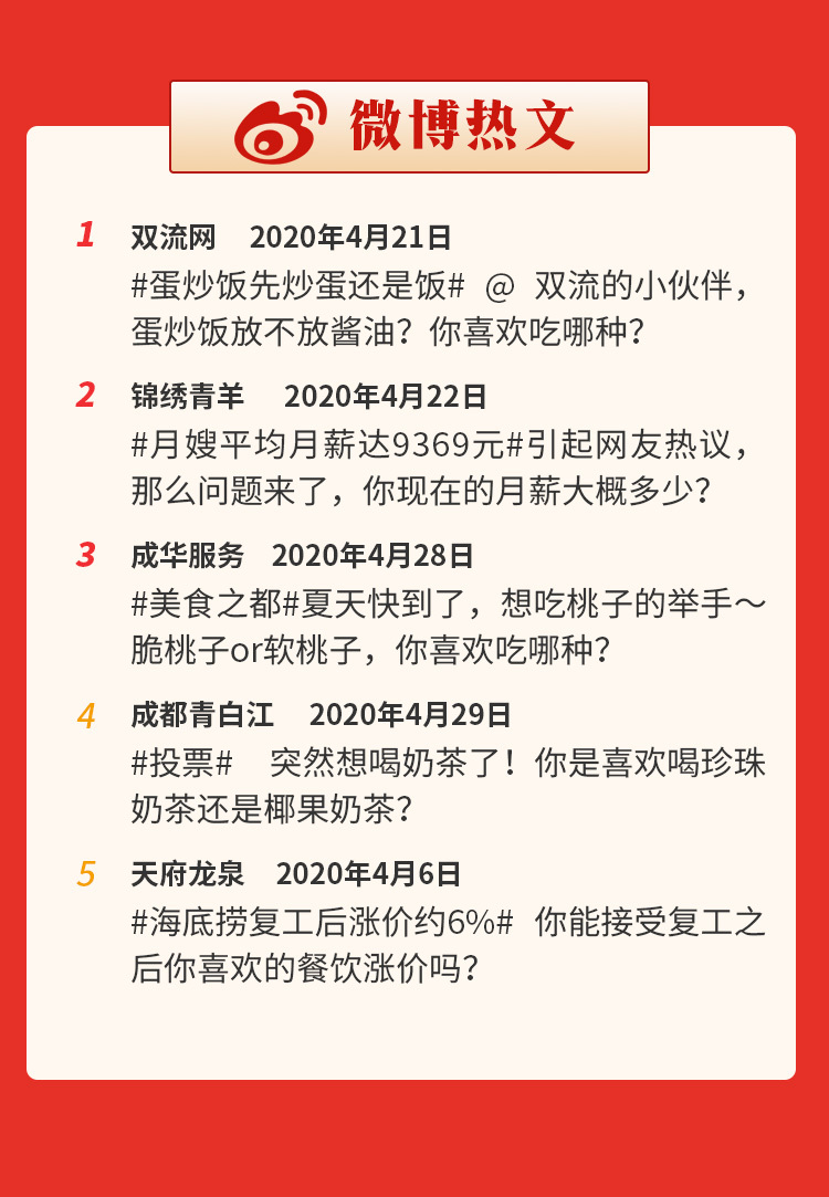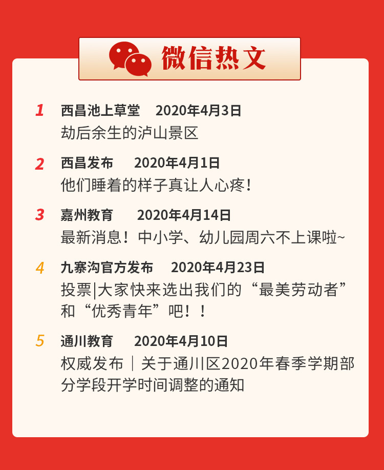 4月,随着疫情得到有效控制,全国各地复工复产,生产生活逐渐恢复常态,尤其是旅游业逐渐回温,各地媒体送景区门票的活动受追捧;川内多所学校发布开学通知,不少家长纷纷感叹“神兽终于回笼了”,各地复课安排广受关注;西昌森林火灾动态是群众在月初的关注重点。