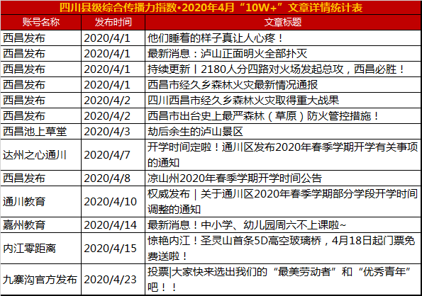 从下列“10万+”文章详情统计表(按发布时间排序)中,“西昌发布”共产出7篇(占比54%);达州通川区的学校相关通知颇受当地关注,“达州之心通川”“通川教育”微信号均创造了相关选题的“10万+”文章;“内江零距离”发布的送景区门票活动、“九寨沟官方发布”策划的投票活动在当地的反响较好、互动量高。