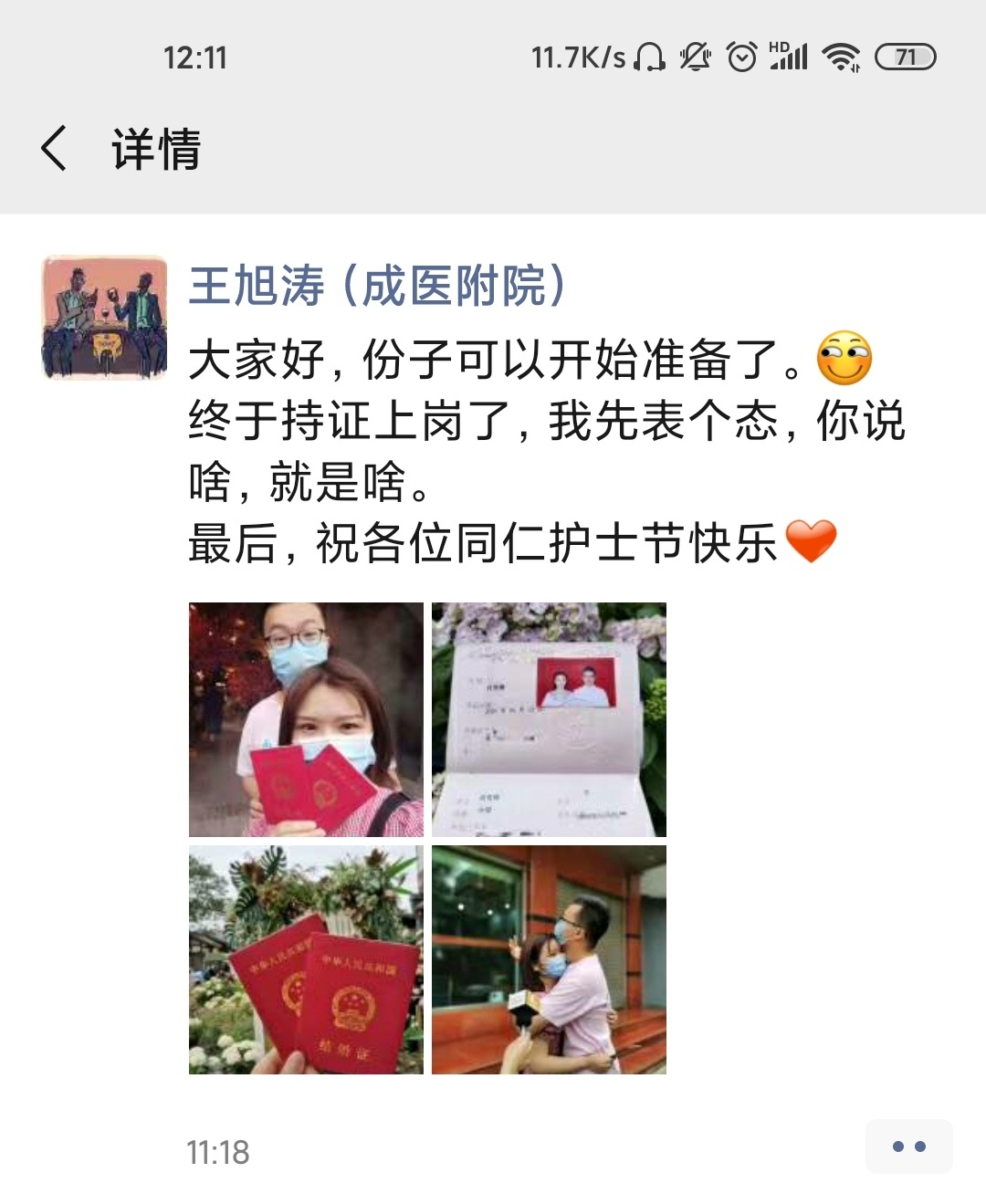 “大家好,终于持证上岗了,我先表个态,今后你说啥就是啥….”5月12日护士节,我省第三批援助湖北医疗队队员、成都医学院第一附属医院重症医学科男护士王旭涛和女朋友加同事肖雪梅在成都市青羊区民政局领证。