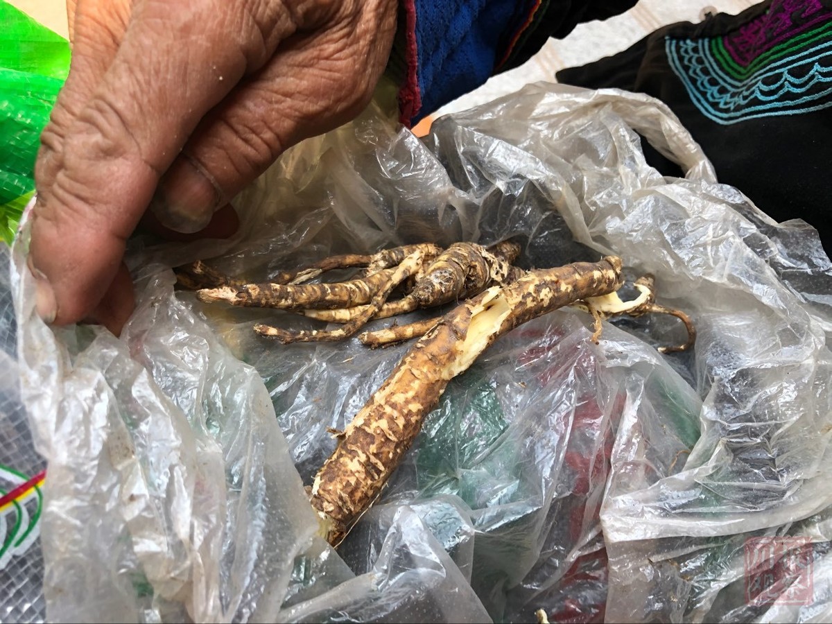 这是一种类似人参的中药材,但是比一般的人参要长要粗。听附近村民讲,吃了这种中药材可以防止晕车。